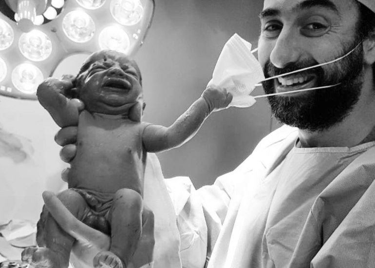 Esta épica imagen se trata de un bebé recién nacido que le quitó la mascarilla al doctor que lo recibió en el parto, dejando...