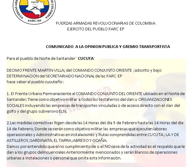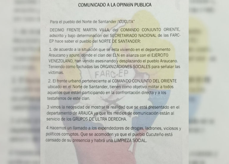 Por redes sociales circula un documento dirigido a la comunidad del Catatumbo en nombre del ELN y las Desidencias de las Farc, en donde...