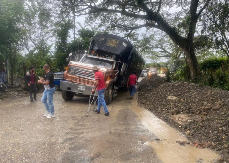 En las últimas horas este vehículo de carga pesada quedó bloqueado en una alcantarilla que se está instalando en el sector La Florida –...
