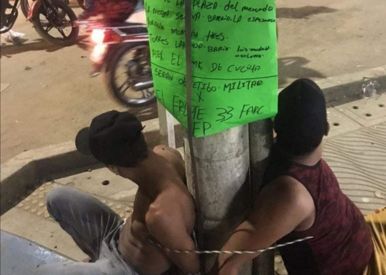 En las últimas horas en el municipio de Tibú, Norte de Santander, dos hombres fueron amarrados a un poste junto con un cartel que...